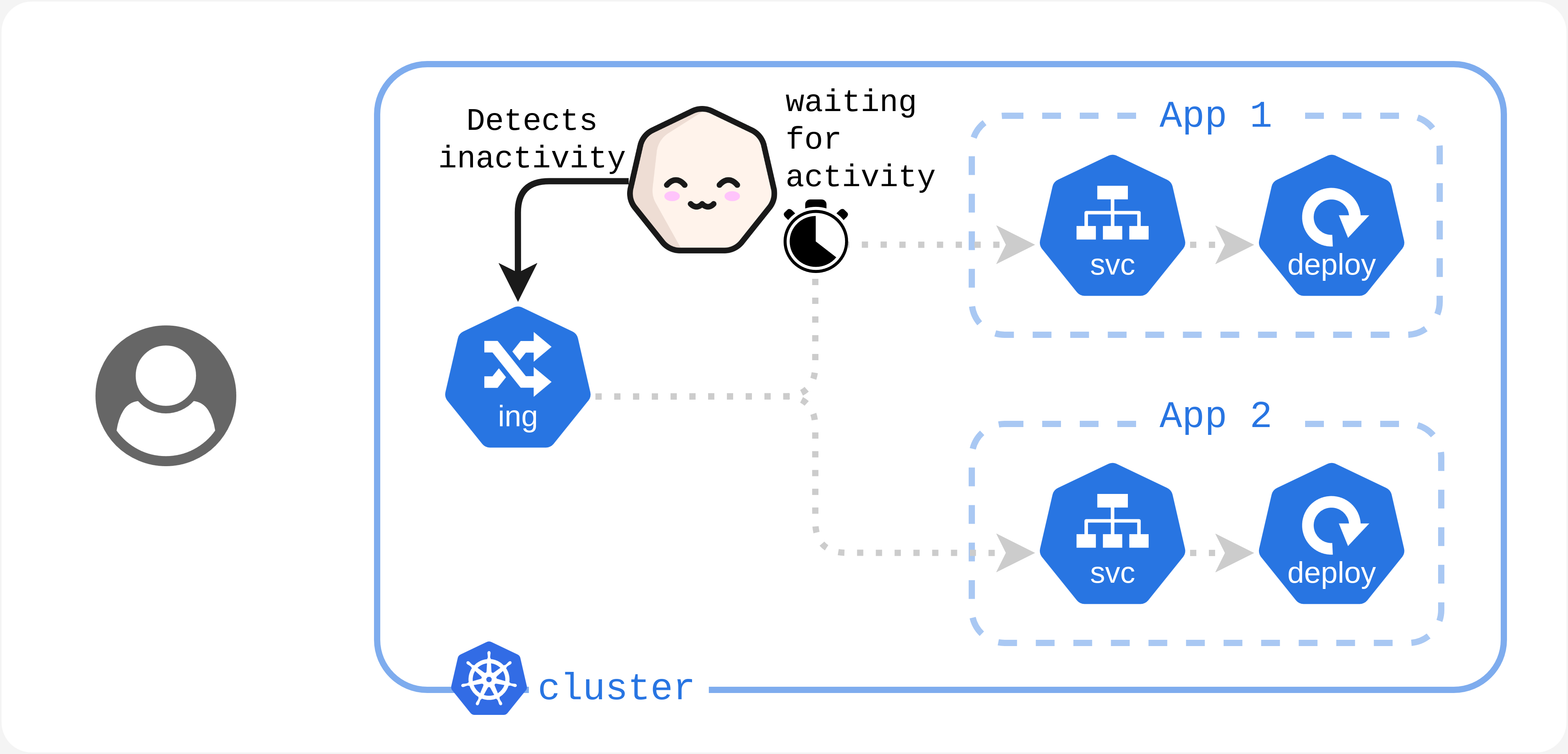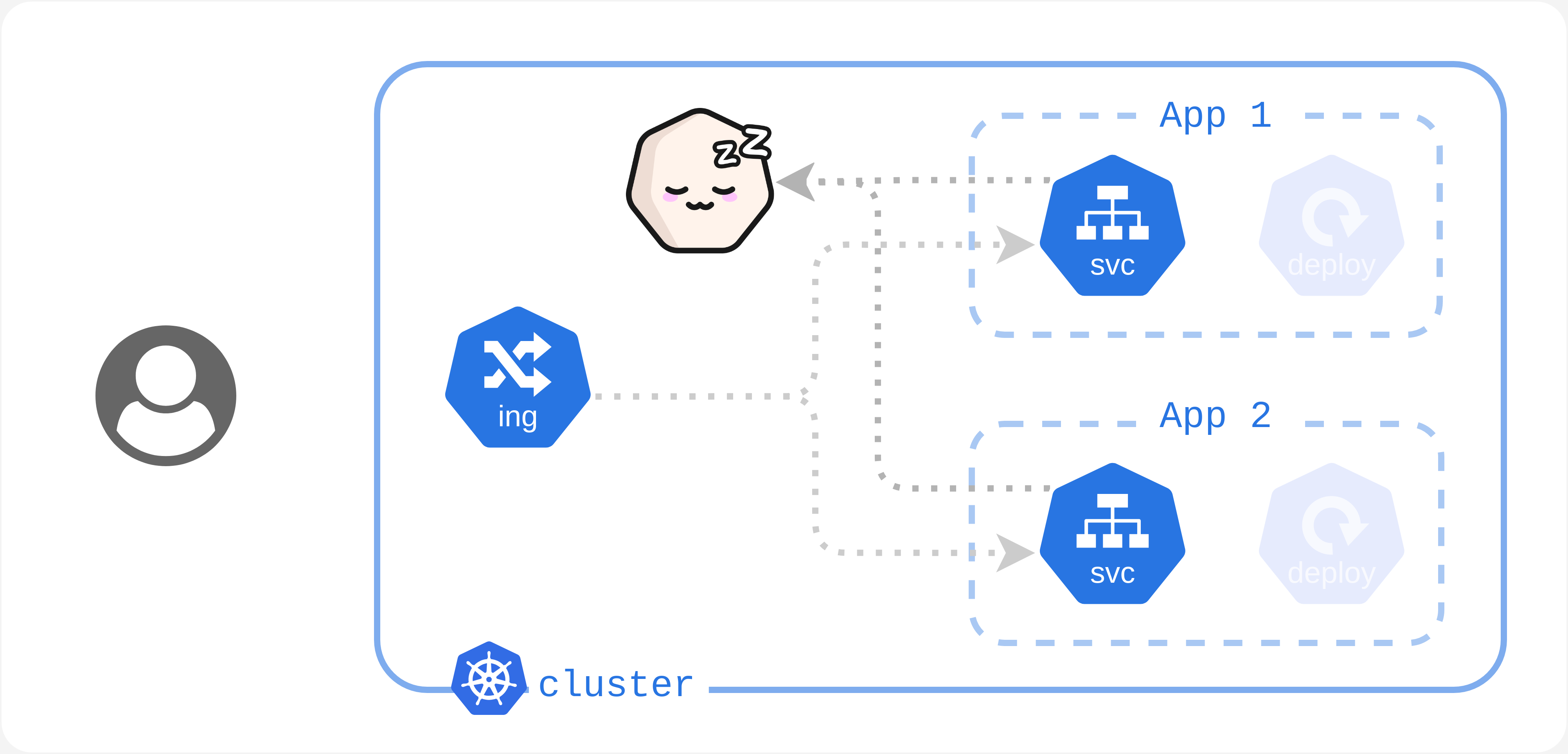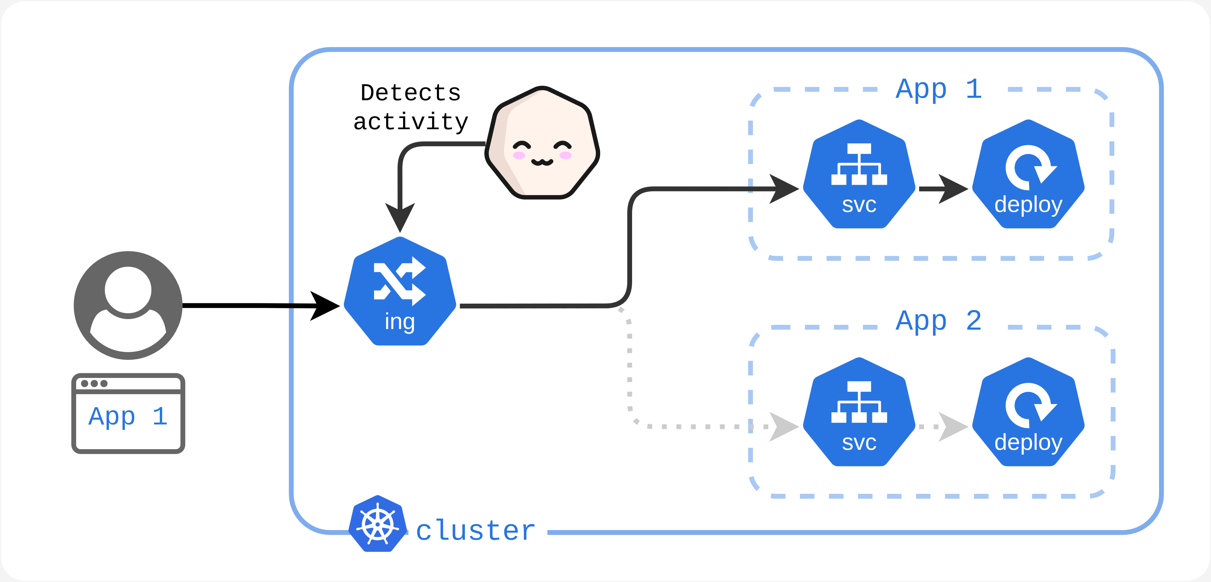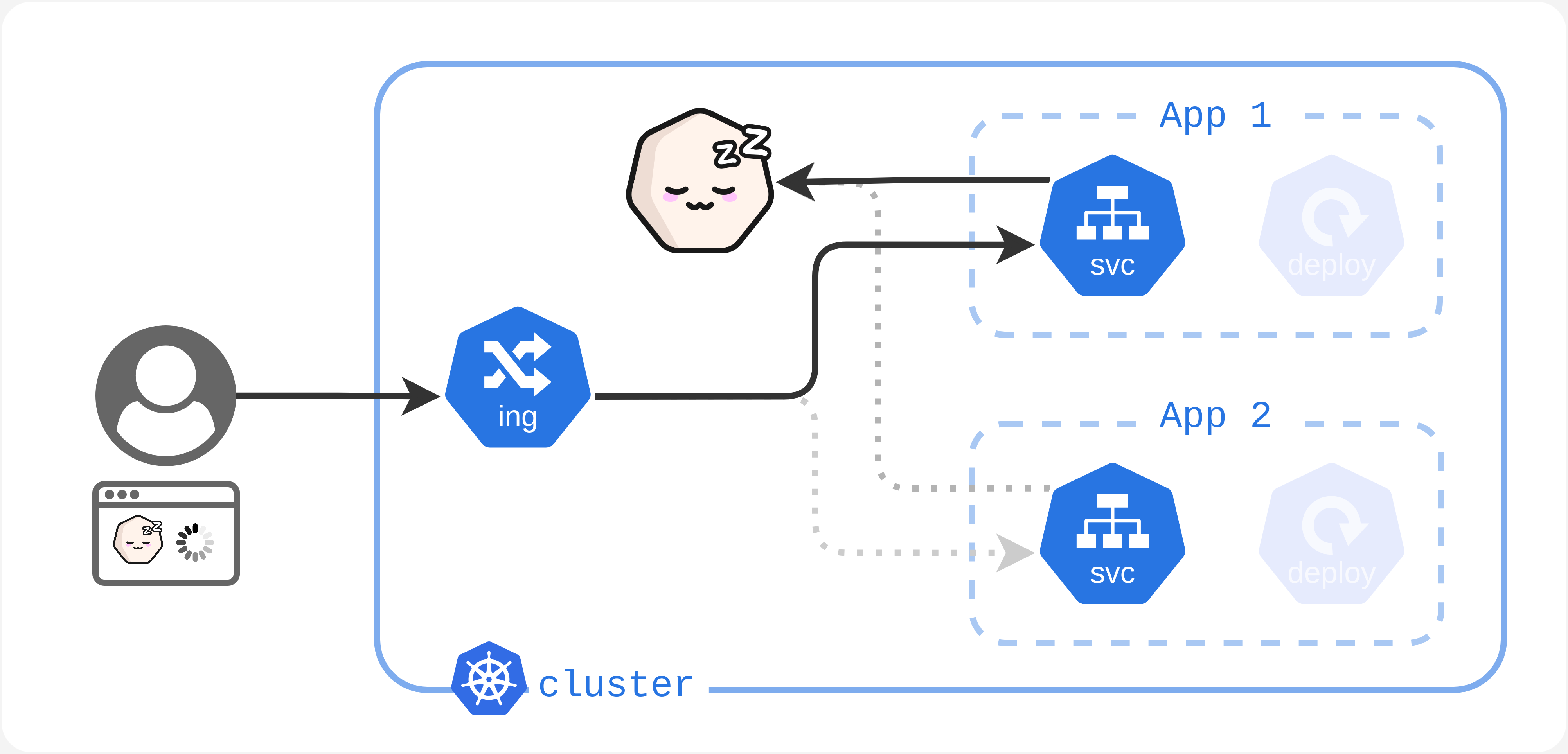 replicas: 0$). - Services redirect traffic to Kubesleeper instead of their normal load resources.